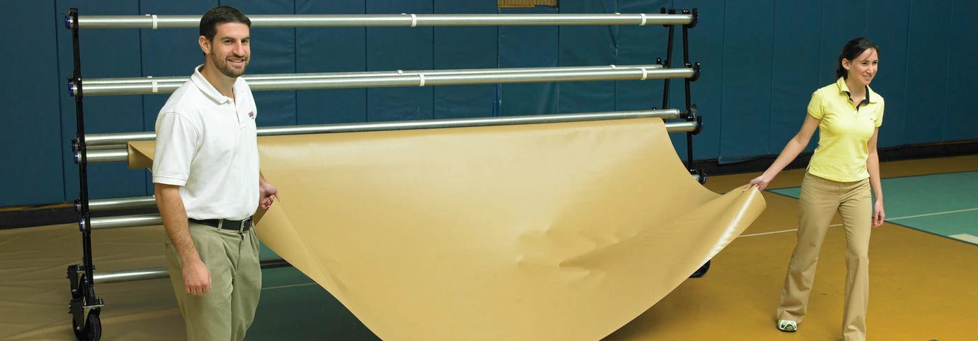 Covers are constructed in 10′ Wide sections for easy handling. Two people can lay down and roll up sections covering the entire gym floor.