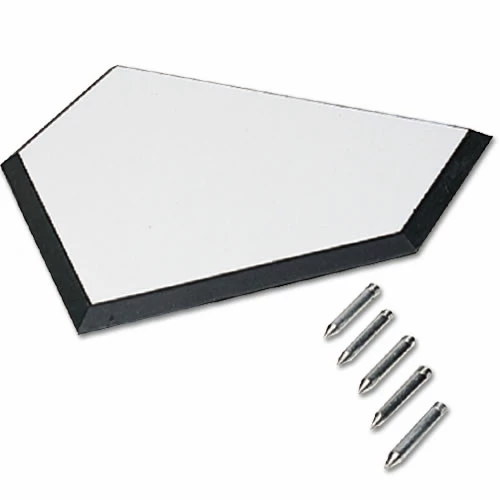 Official home plate for baseball and softball. Solid white rubber with black beveled edges for safety. Includesย 5 spikes. Weight: 10 lbs.